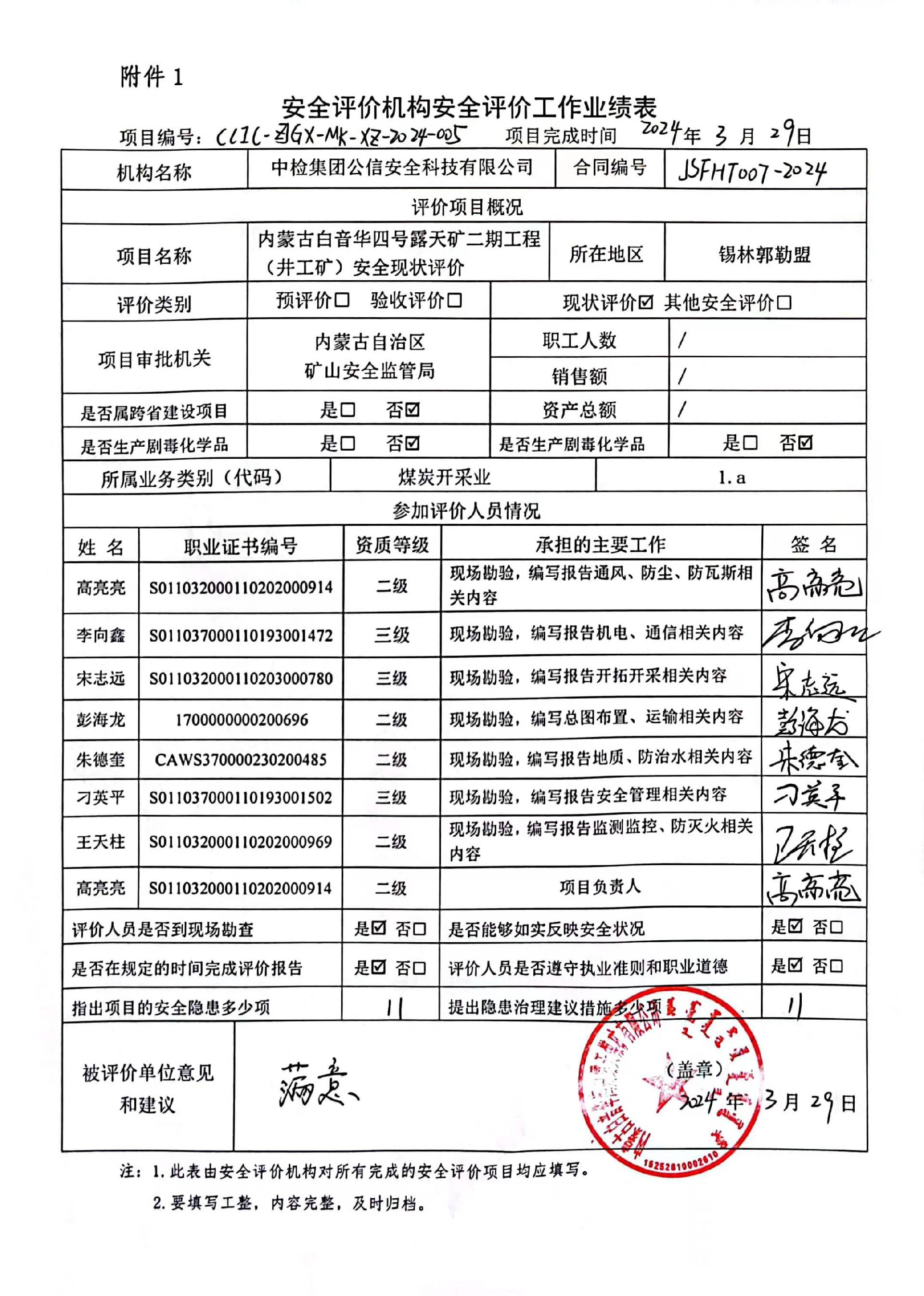 評價項(xiàng)目名稱 | 內(nèi)蒙古白音華四號露天礦二期工程(井工礦)安全現(xiàn)狀評價 | |||||