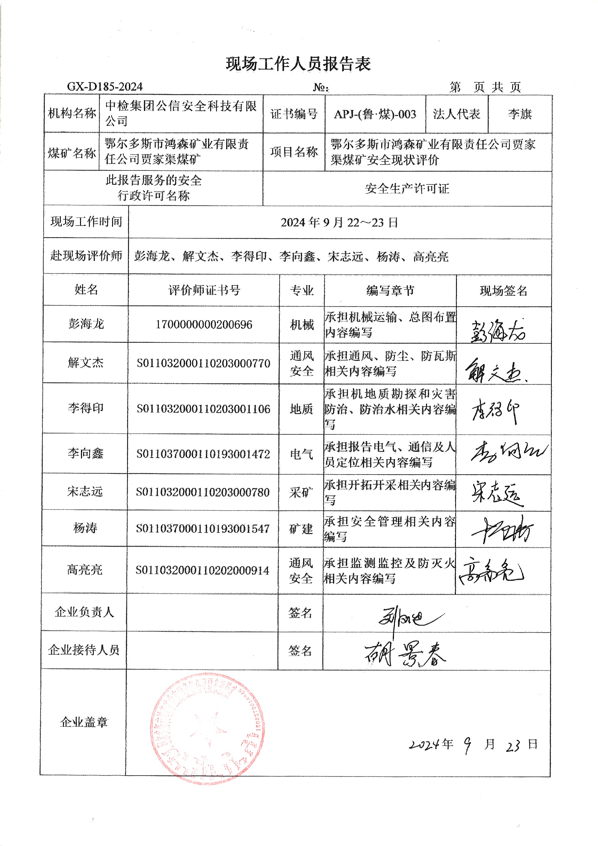 現(xiàn)場開展安全評價工作的人員、時間及主要任務: 彭海龍 李得印 解文杰 李向鑫 宋志遠 高亮亮 楊濤 于2024年9月22~23日到現(xiàn)場進行調(diào)查、搜集資料,進行現(xiàn)場評價。 于2024年11月5日到現(xiàn)場評價時存在的問題進行了復查。 | |||||||