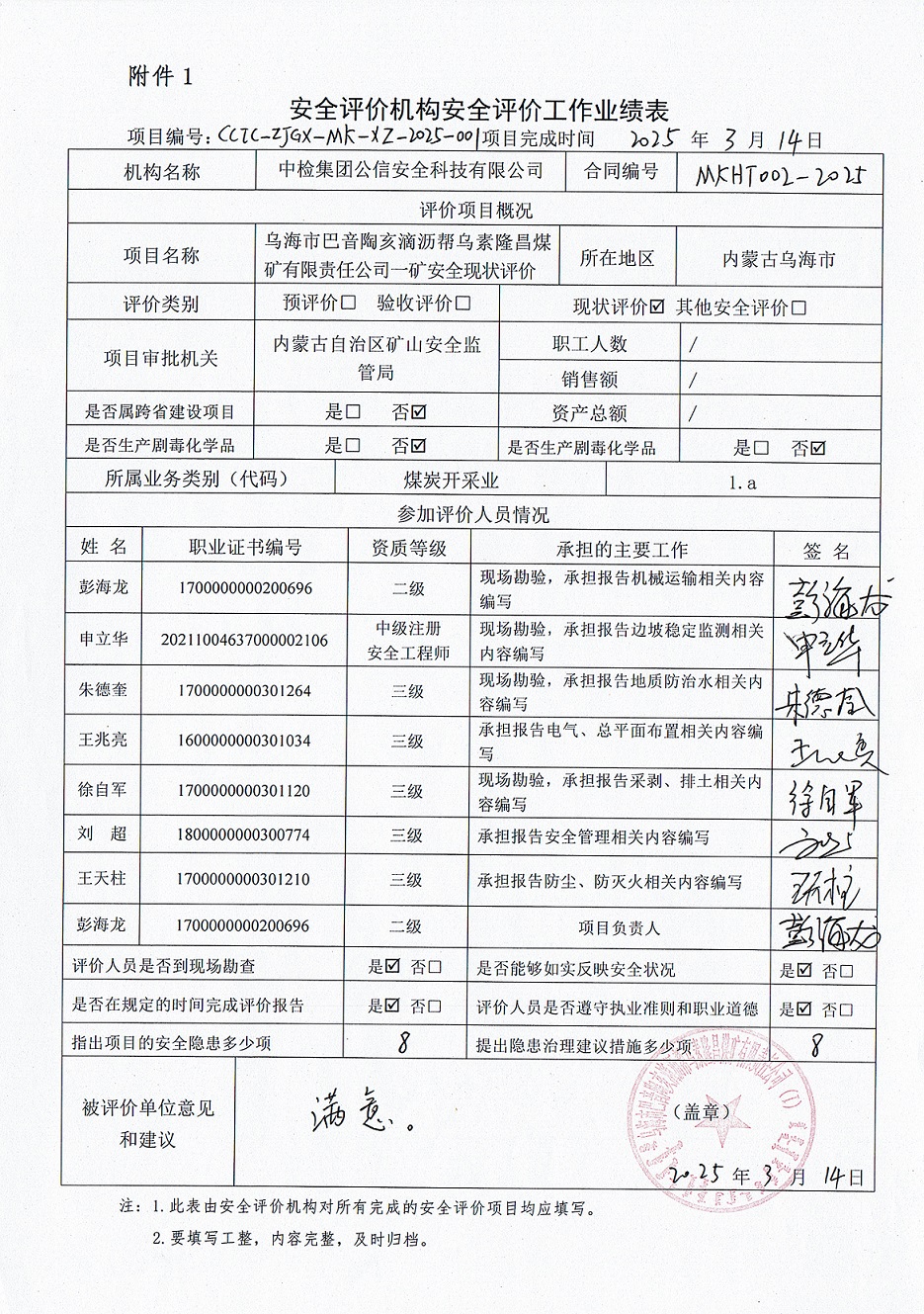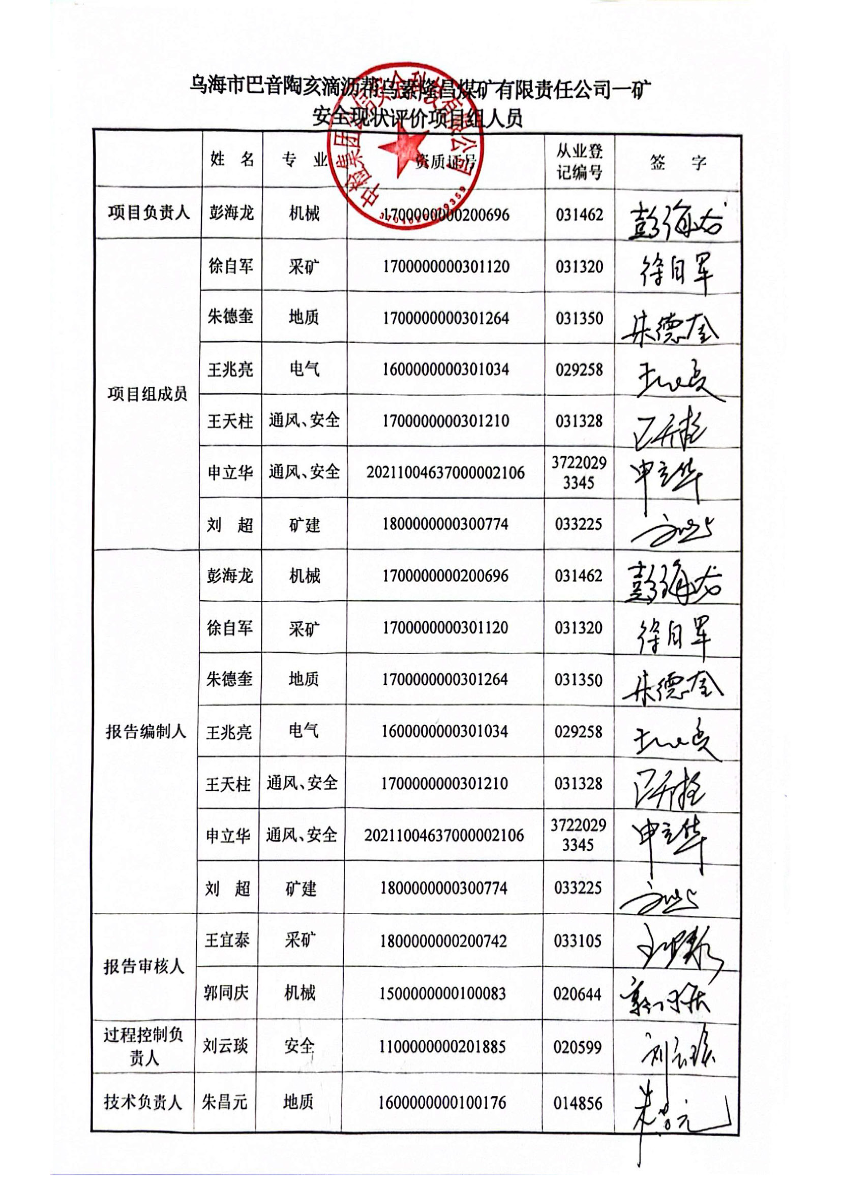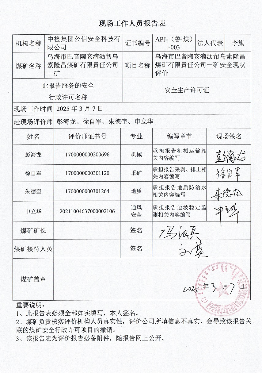 現(xiàn)場開展安全評價工作的人員、時間及主要任務(wù): 彭海龍 徐自軍 朱德奎 申立華 于2025年3月7日到現(xiàn)場進(jìn)行調(diào)查、搜集資料,進(jìn)行現(xiàn)場評價。 于2025年3月9日到現(xiàn)場評價時存在的問題進(jìn)行了復(fù)查。 2025年4月15日,烏海市應(yīng)急管理局組織專家對隆昌煤礦進(jìn)行了安全生產(chǎn)許可證發(fā)證現(xiàn)場核查,按照核查要求對報告內(nèi)容進(jìn)行了修改,出具此版《烏海市巴音陶亥滴瀝幫烏素隆昌煤礦有限責(zé)任公司一礦安全現(xiàn)狀評價報告》。 | |||||||