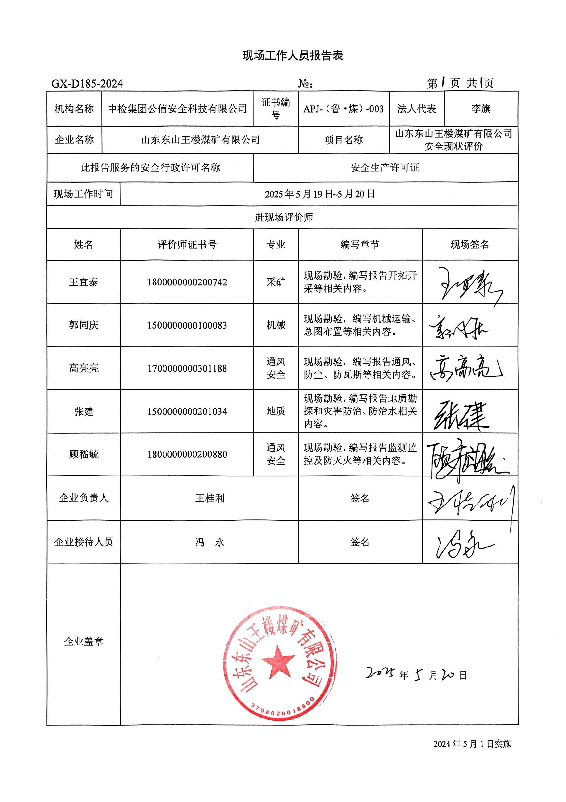 到現(xiàn)場開展安全評價工作的人員、時間及主要任務(wù): 人員:王宜泰、郭同慶、高亮亮、顧嵇毓、張建 時間、任務(wù): 評價項目組于2025年5月19日~20日到現(xiàn)場調(diào)查、檢查;2025年5月22日編寫修改完善報告。 | ||||||