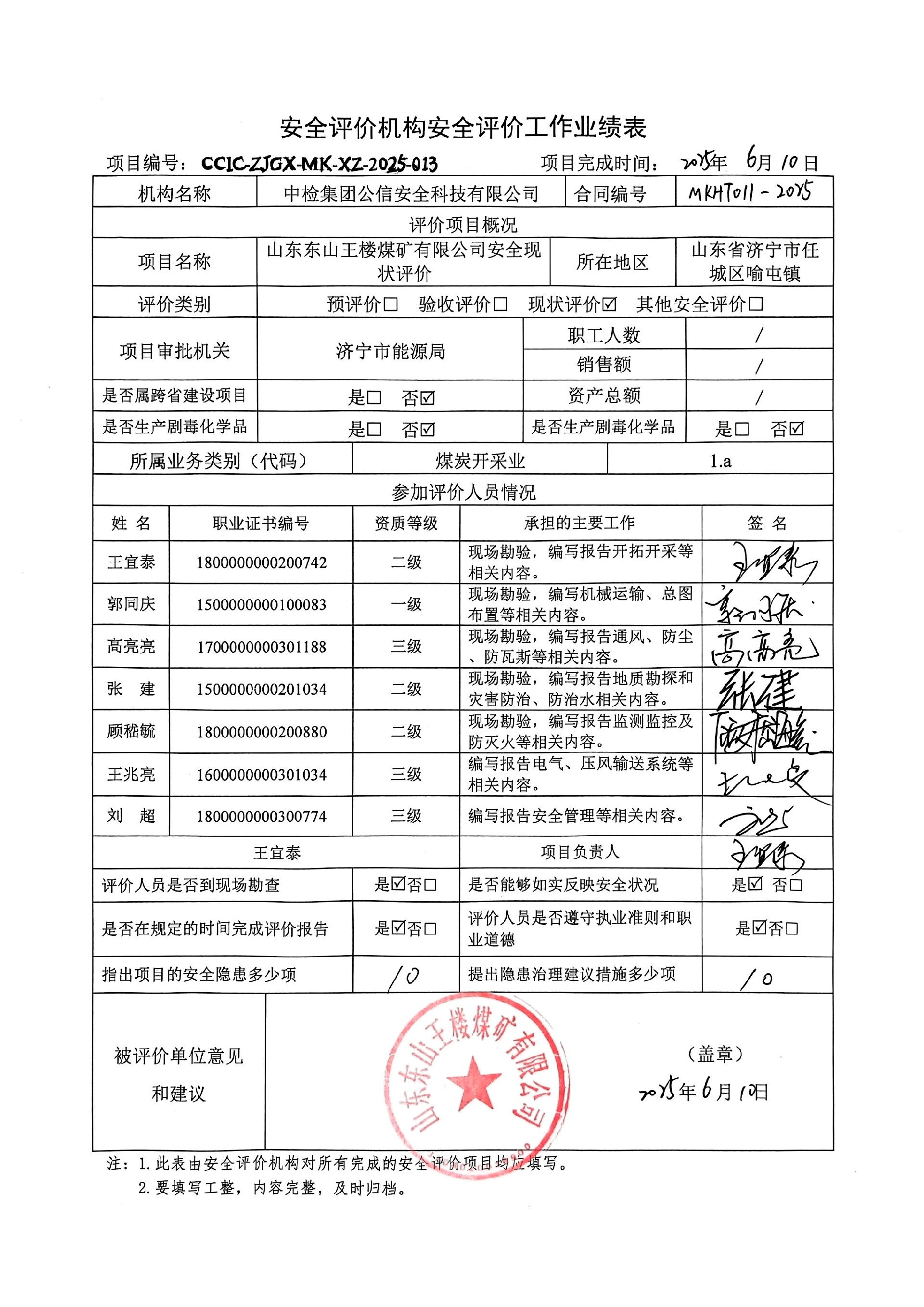 評價項目名稱 | 山東東山王樓煤礦有限公司安全現(xiàn)狀評價報告 | |||||