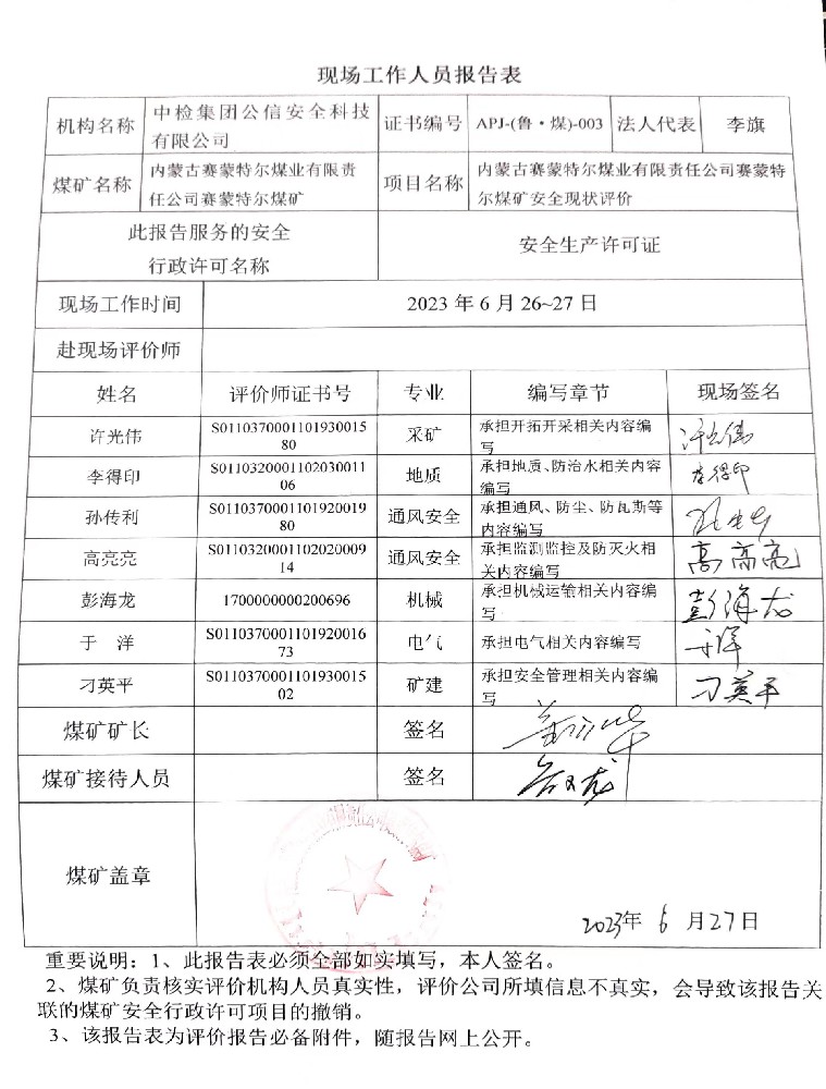 2023年3.2內(nèi)蒙古賽蒙特爾煤業(yè)有限責任公司賽蒙特爾煤礦安全現(xiàn)狀評價
