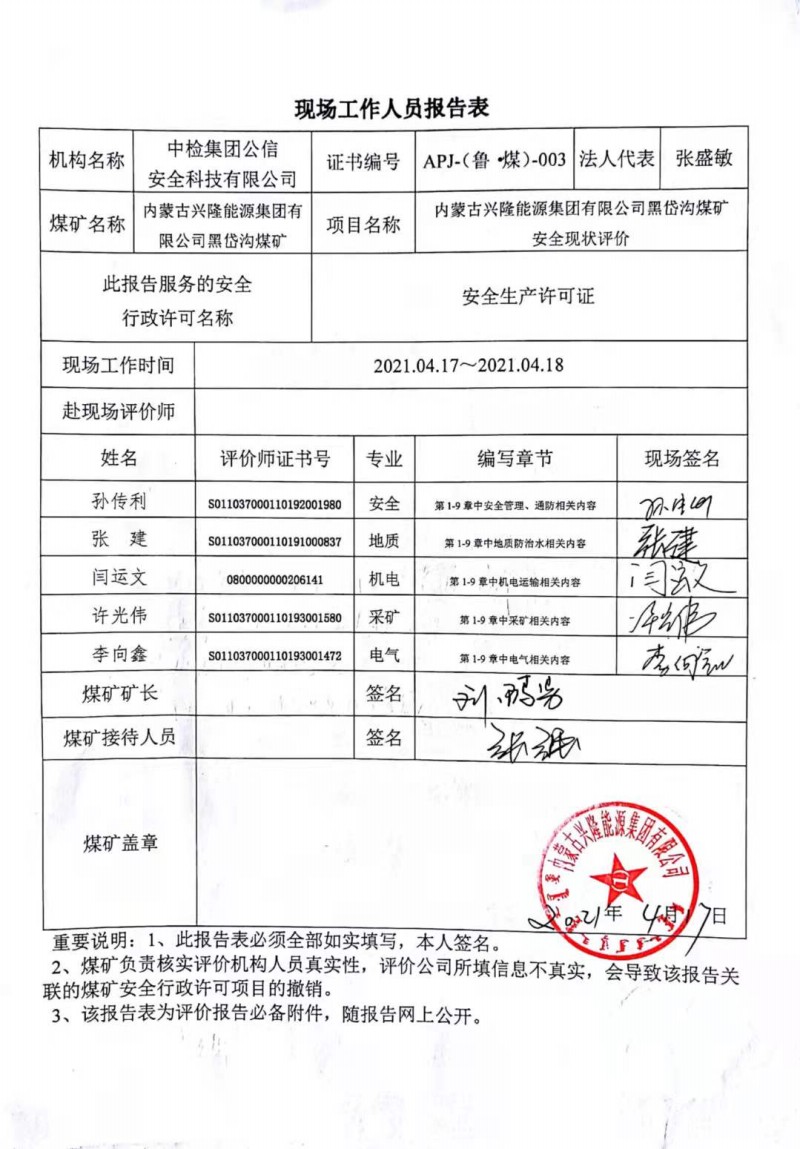 安全評(píng)價(jià)報(bào)告網(wǎng)上公開信息表 季度:四季度 評(píng)價(jià)項(xiàng)目名稱 內(nèi)蒙古興隆能源集團(tuán)有限公司黑岱溝煤礦安全現(xiàn)狀評(píng)價(jià)