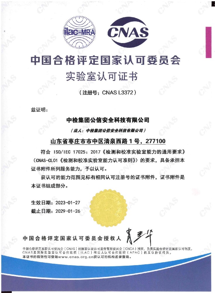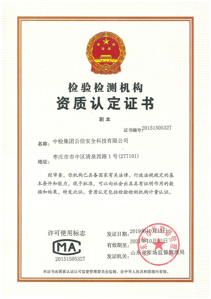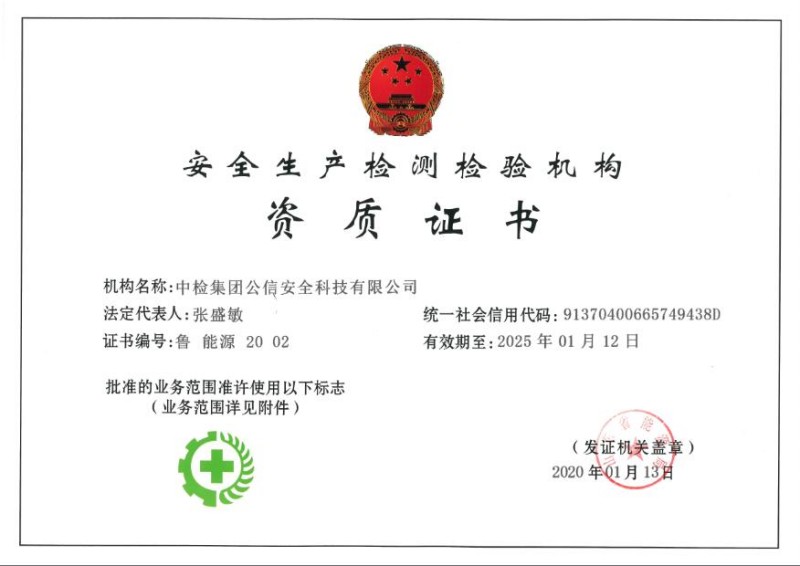 機構(gòu)名稱:中檢集團公信安全科技有限公司證書編號:魯 能源 20 02有效期至:2030年1月12日