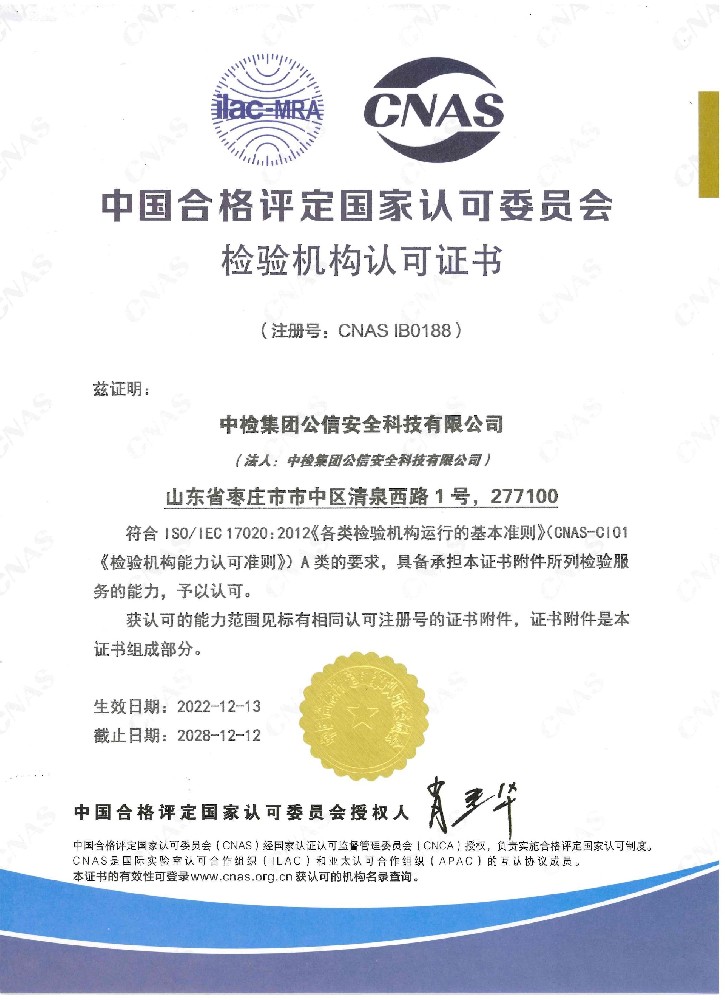 機構(gòu)名稱:中檢集團公信安全科技有限公司證書編號:APJ-(魯·煤)-003有效期至:2030年1月12日