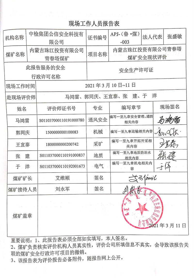 安全評(píng)價(jià)報(bào)告網(wǎng)上公開(kāi)信息表 季度:二季度 評(píng)價(jià)項(xiàng)目名稱(chēng) 內(nèi)蒙古珠江投資有限公司青春塔煤礦安全現(xiàn)狀評(píng)價(jià)