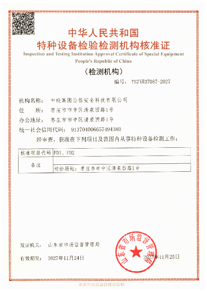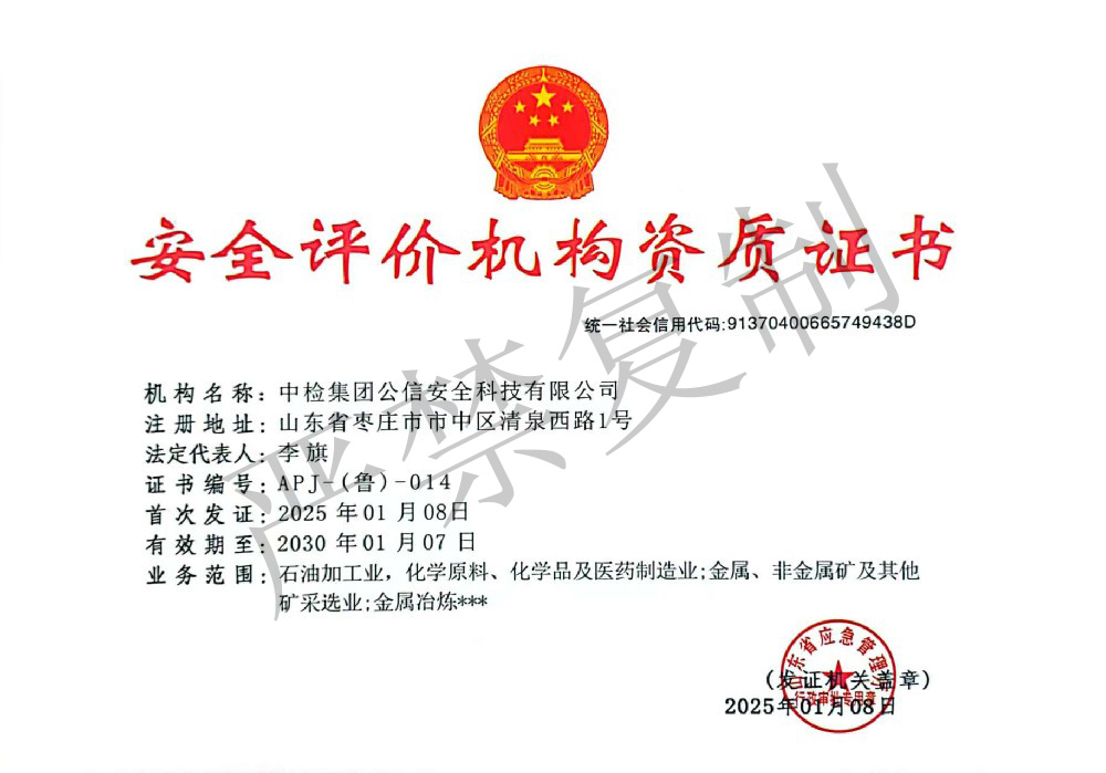 機構(gòu)名稱:中檢集團公信安全科技有限公司證書編號:魯 應急 25 01有效期至:2030年01月07日
