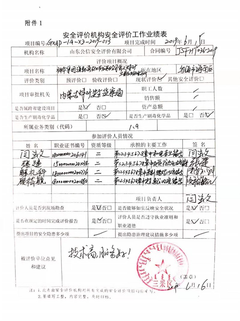 | 現(xiàn)場(chǎng)開展安全評(píng)價(jià)工作的人員、時(shí)間及主要任務(wù): 閆運(yùn)文、張建、解禮科、顧嵇毓 于2019年4月20日到現(xiàn)場(chǎng)進(jìn)行調(diào)查、搜集資料,進(jìn)行現(xiàn)場(chǎng)評(píng)價(jià)。 |