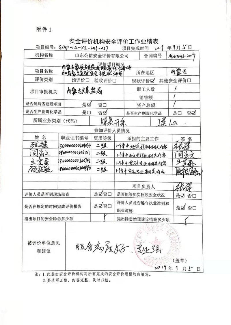 | 現(xiàn)場開展安全評價(jià)工作的人員、時(shí)間及主要任務(wù): 張建 閆云文 王宜泰 顧嵇毓 于2019年6月24日到現(xiàn)場進(jìn)行調(diào)查、搜集資料,進(jìn)行現(xiàn)場評價(jià)。 于2019年8月15日到現(xiàn)場評價(jià)時(shí)存在的問題進(jìn)行了復(fù)查。 |