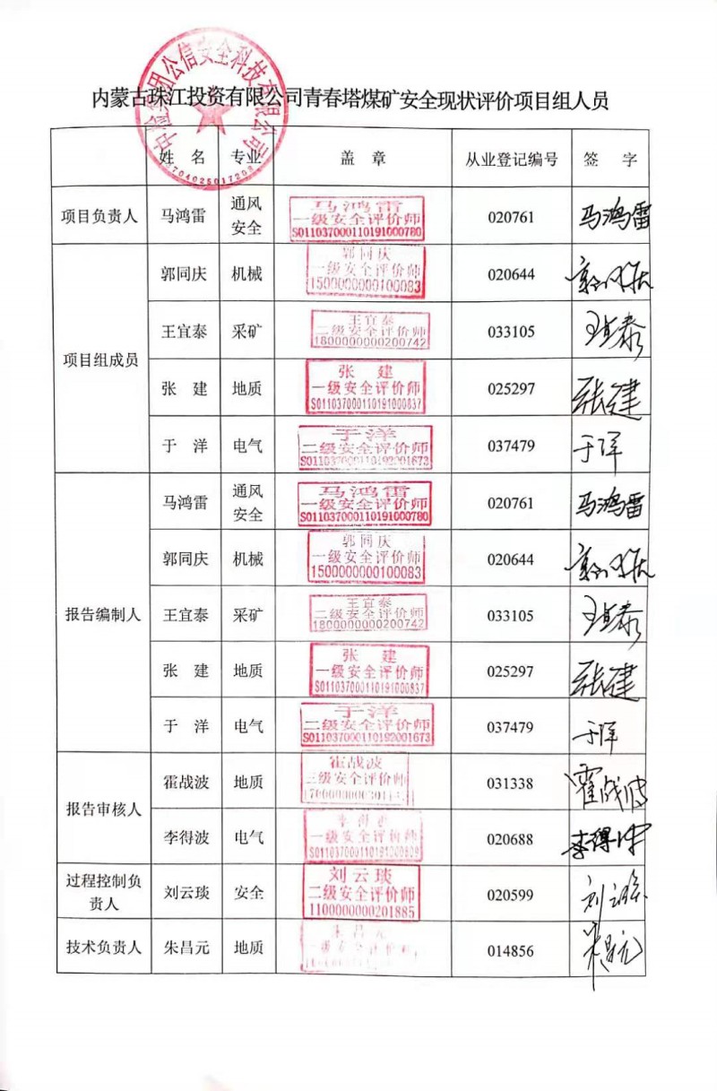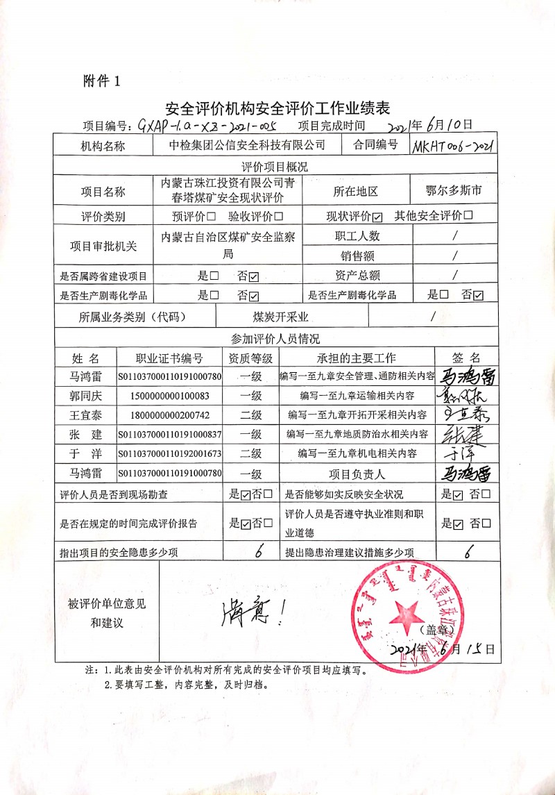 | 評價項目名稱 | 內蒙古珠江投資有限公司青春塔煤礦安全現(xiàn)狀評價報告 | ||||||