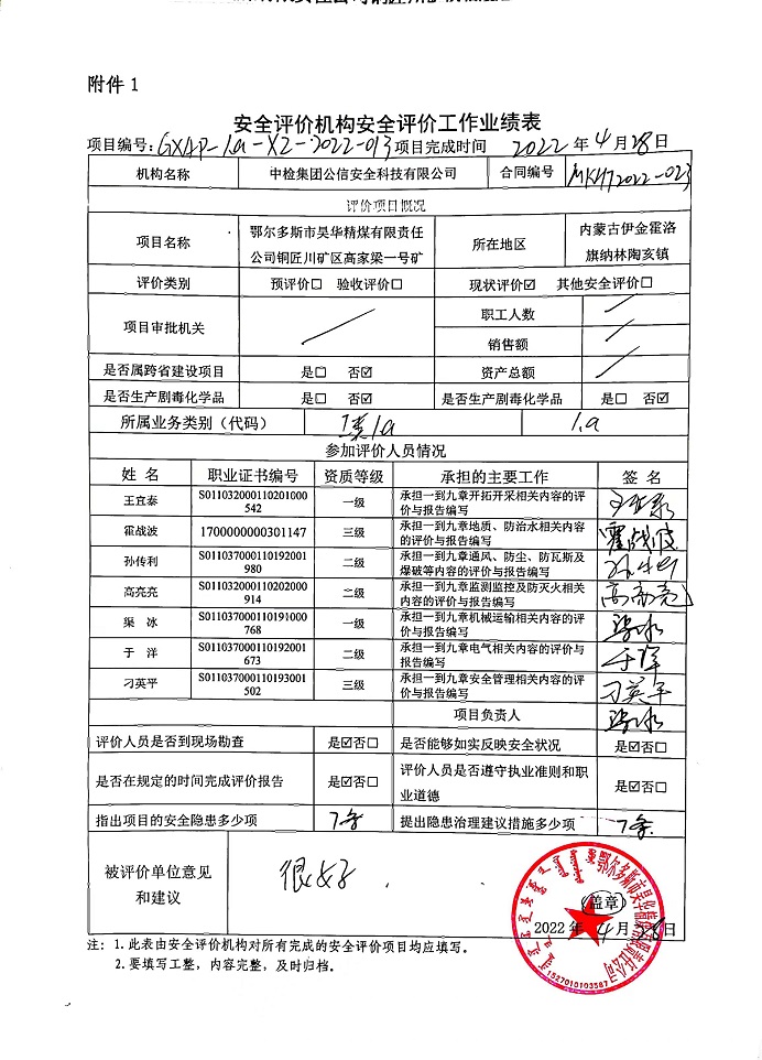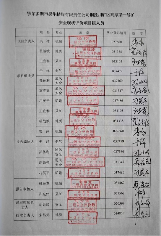 | 評價項目名稱 | 鄂爾多斯市昊華精煤有限責(zé)任公司銅匠川礦區(qū)高家梁一號礦安全現(xiàn)狀評價報告 | ||||||